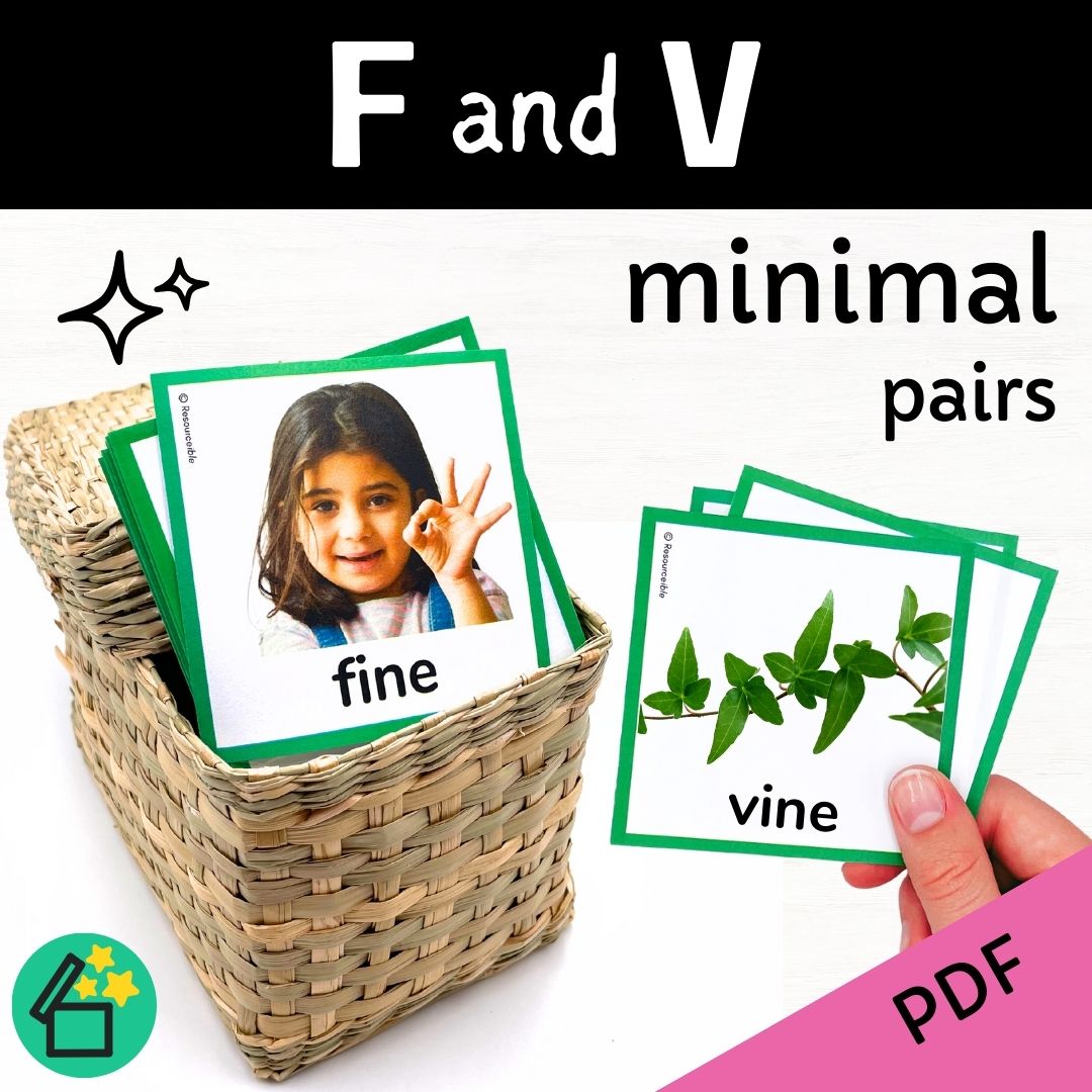 Set of 5 minimal pairs F and V flash cards. Instant PDF download with game ideas included!